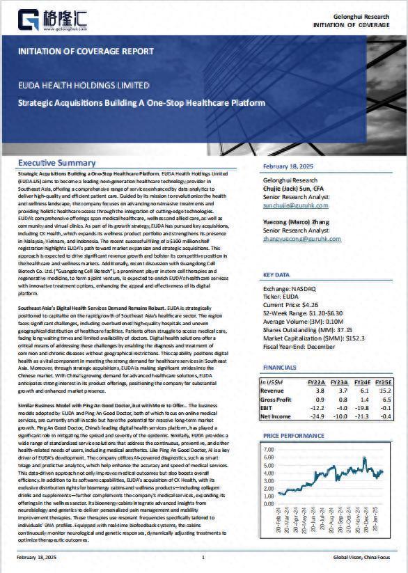 格隆汇中概研究院发布EUDA Health Holdings Limited(EUDA.US)首次覆盖报告《Strategic Acquisitions Building AOne-Stop Healthcare Platform》。EUDA 致力于成为东南亚领先的下一代医疗科技提供商,借助数据分析,提供高质量、高效率的护理服务。公司以革新健康领域为使命,专注于推进非侵入性治疗,整合尖端技术,提供全面的医疗、健康和虚拟诊所服务。为实现战略增长,EUDA收购了 CK Health,扩充健康产品组合,强化在马来西亚、越南和印尼的市场地位。CK Health 拥有生物能量舱、胶原蛋白饮品等健康产品的独家分销权,丰富了 EUDA的服务。东南亚数字健康需求强劲。面对医疗资源不均,数字健康解决方案可跨越地域限制,满足患者需求。